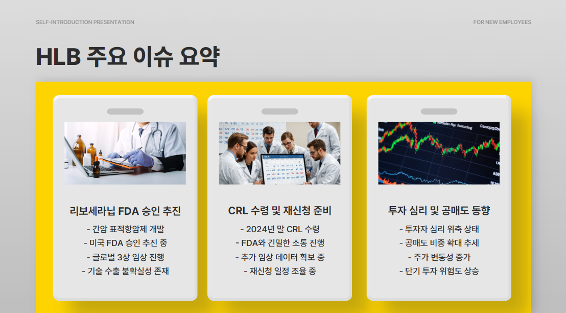 HLB는 간암 표적항암제 ‘리보세라닙’의 FDA 승인을 추진해 왔지만, 2024년 말 CRL 수령 이후 재신청 준비 중이에요. 승인 지연이 장기화되며 투자자 심리는 위축된 상태이고, 공매도 비중은 확대되는 추세입니다.