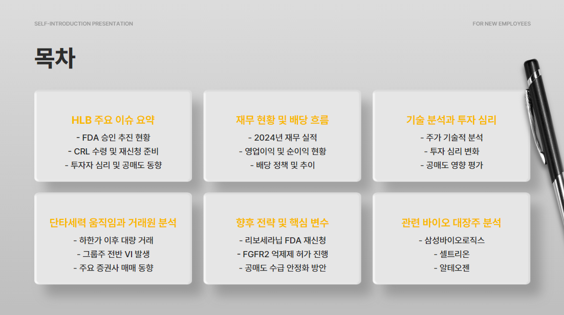 HLB는 리보세라닙의 FDA 재도전, 공매도 수급 안정 여부 등 고위험-고수익 국면의 대표 종목입니다. 단타보다는 IR과 뉴스 플로우에 반응하는 분할매매 전략이 요구되며, 실적보다는 기대감 위주의 움직임임을 명확히 인지해야 해요.