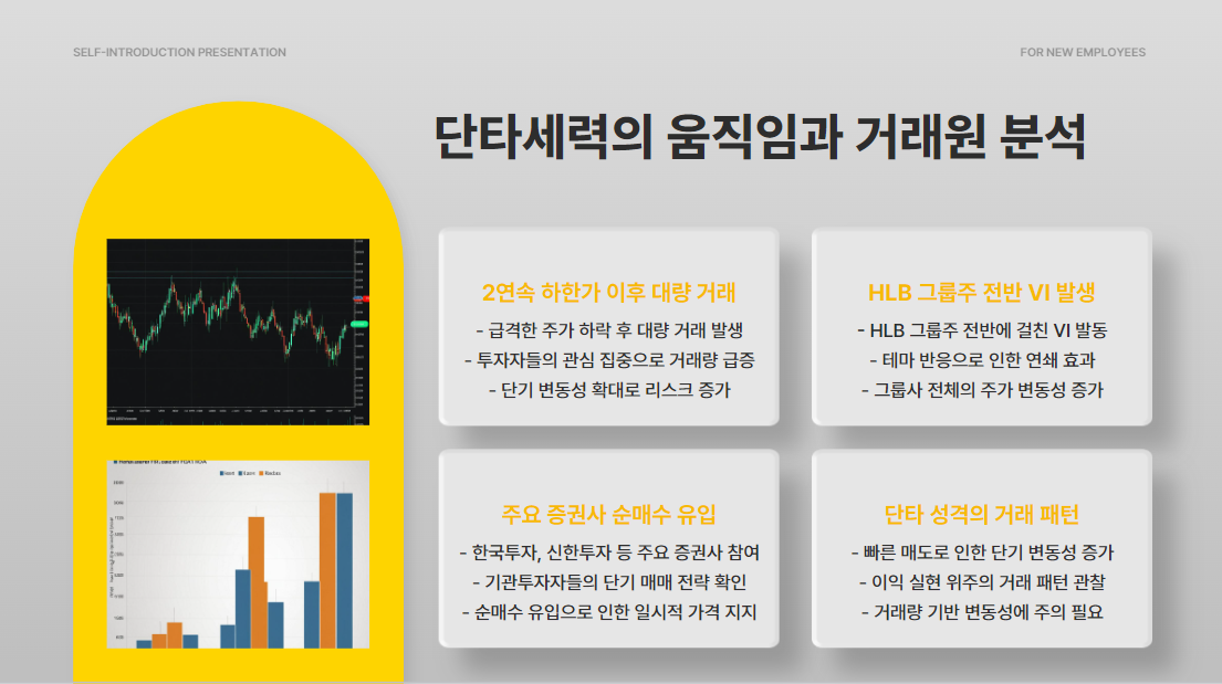 2연속 하한가 이후, 대량 거래가 발생하며 HLB 그룹주 전반에 VI 발생 등 테마 반응이 있었어요. 한국투자, 신한투자 등 주요 증권사에서 순매수가 유입됐으나, 이익 실현 후 빠른 매도로 단타 성격이 짙었습니다. 거래량 기반 변동성에 유의가 필요해요.