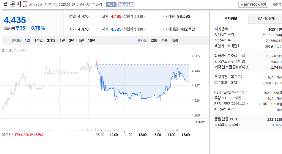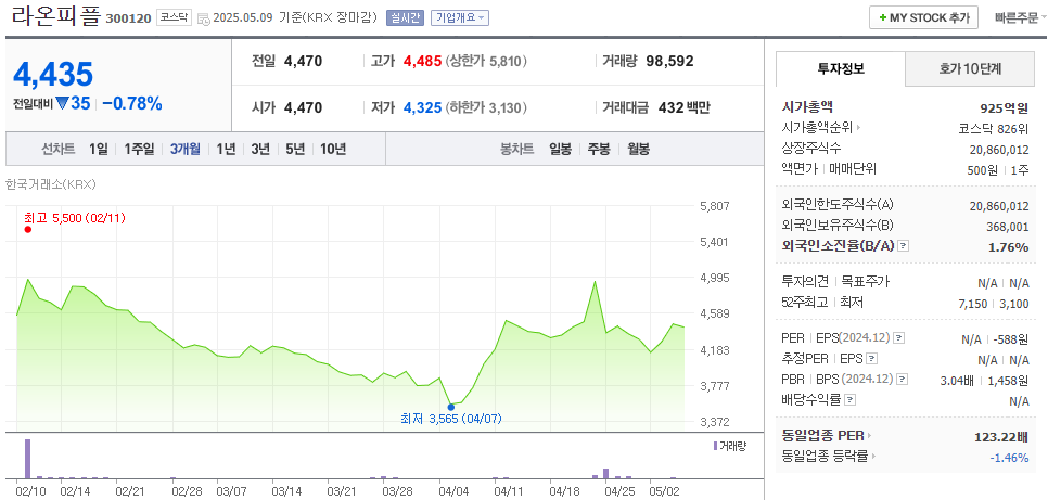 라온피플의 주가는 52주 최저가인 3,100원에서 약 43% 상승하여 현재 4,435원을 기록하고 있습니다.