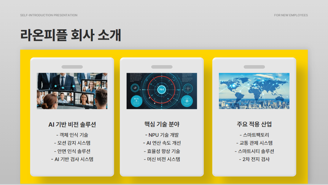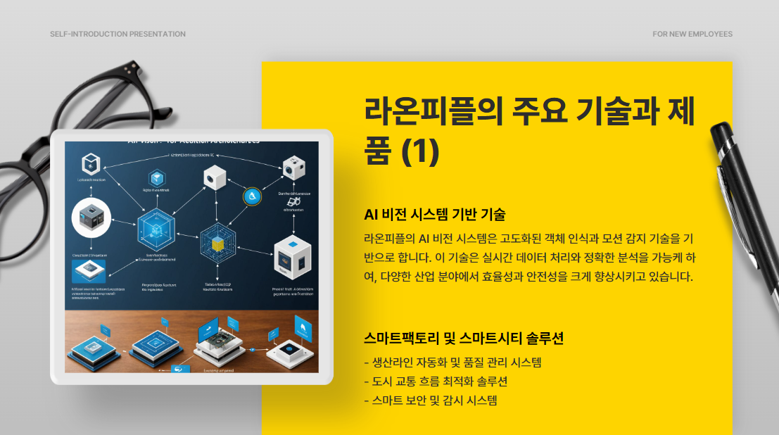 라온피플은 AI 기반 비전 솔루션을 제공하는 기업으로, 객체 인식, 모션 감지, 안면 인식 등 다양한 AI 기술을 보유하고 있습니다. 회사는 이러한 기술을 바탕으로 스마트팩토리, 교통관제, 스마트시티 등 다양한 분야에서 AI 검사 시스템을 적용해 효율적인 자동화 솔루션을 제공하고 있습니다. 특히, 라온피플은 NPU(Neural Processing Unit) 기술을 통해 AI 연산 속도와 효율성을 크게 개선하여 업계에서 주목받고 있습니다.