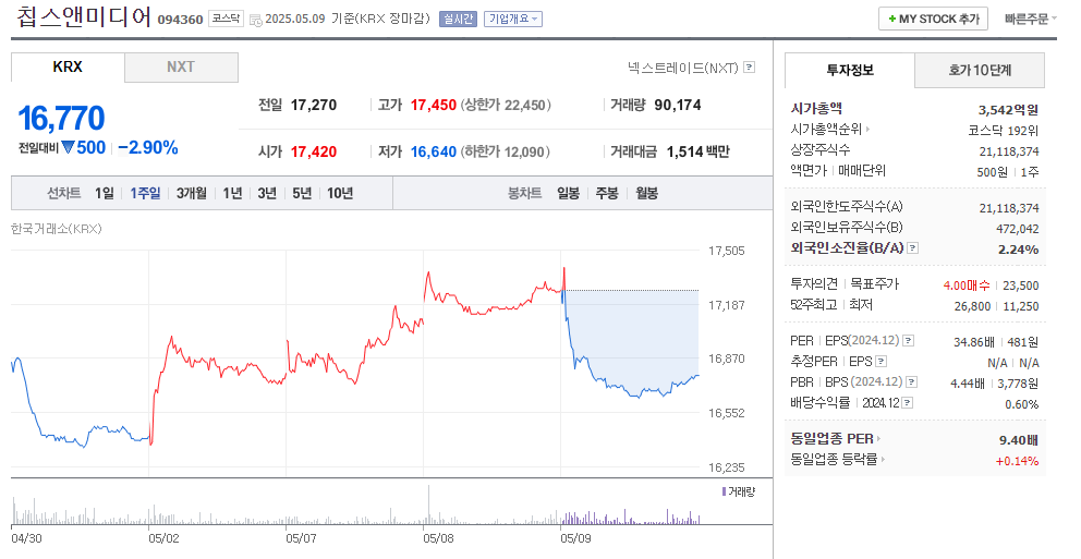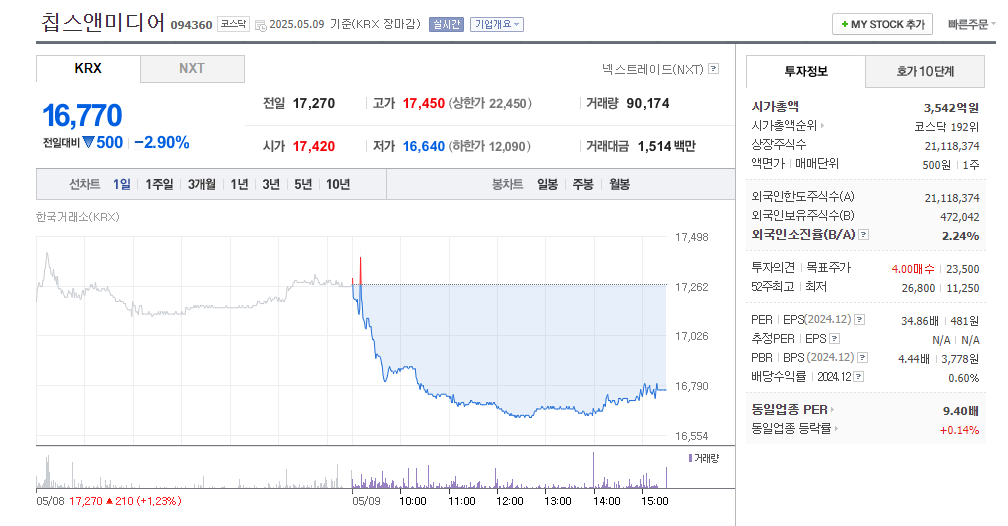 2025년 5월 11일 기준 칩스 앤 미디어 주가는 16770원입니다. 전일 대비 소폭 하락했지만 전체 흐름으로 보면 강세를 지속하고 있습니다.