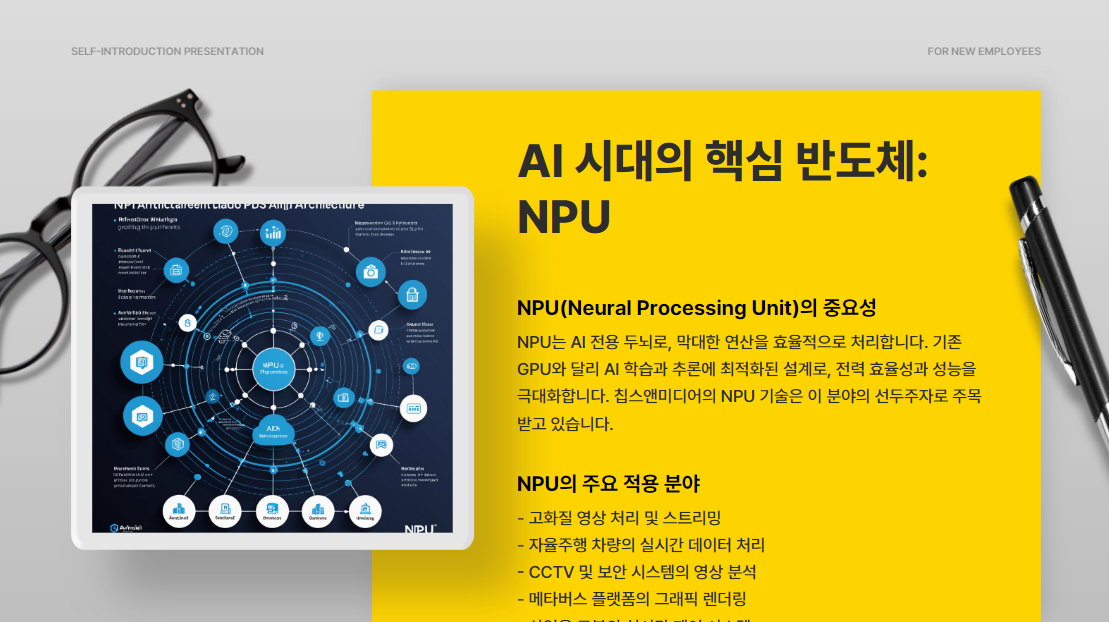 AI 학습과 추론을 위해서는 막대한 연산이 필요하고 NPU는 이 연산을 전용 설계로 처리 효율을 극대화한 반도체입니다. 특히 영상 처리 자율주행 CCTV 메타버스 등의 고도화된 환경에서 영상 전용 NPU가 필요한데 바로 여기에 칩스 앤 미디어가 강점을 가지고 있습니다.