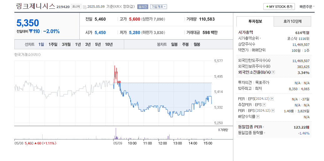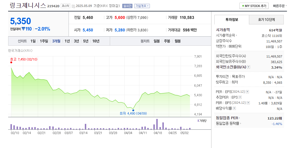 2025년 5월 9일 기준 링크제니시스의 주가는 5350원으로 전일 대비 110원 하락하였습니다. 52주 최고가는 8350원 최저가는 4065원으로 최근 주가는 52주 최저가 대비 약 31.85퍼센트 하락한 수준입니다. 거래량은 110583주 거래대금은 약 6억 원입니다.