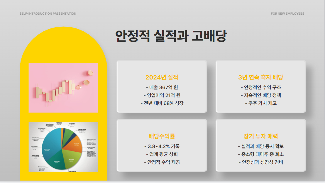 2024년 실적은 매출 367억 원, 영업이익 21억 원으로 전년 대비 68퍼센트 성장했습니다. 3년 연속 흑자 기반 배당을 유지하며 배당수익률도 약 3.8~4.2퍼센트를 기록 중이에요.