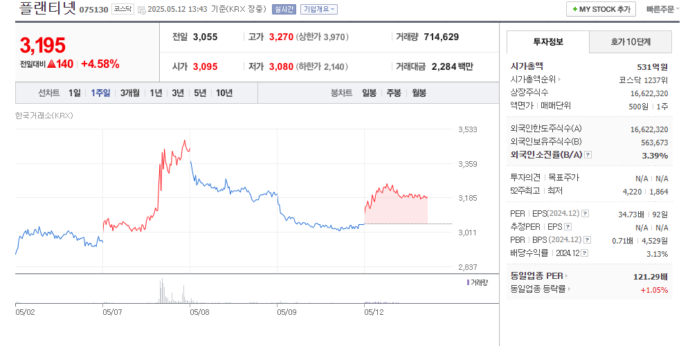 처음 플랜티넷을 접한 건 3000원 초반대였습니다. 차트를 보며 '이 종목은 뭔가 다르다'는 직감이 있었죠.