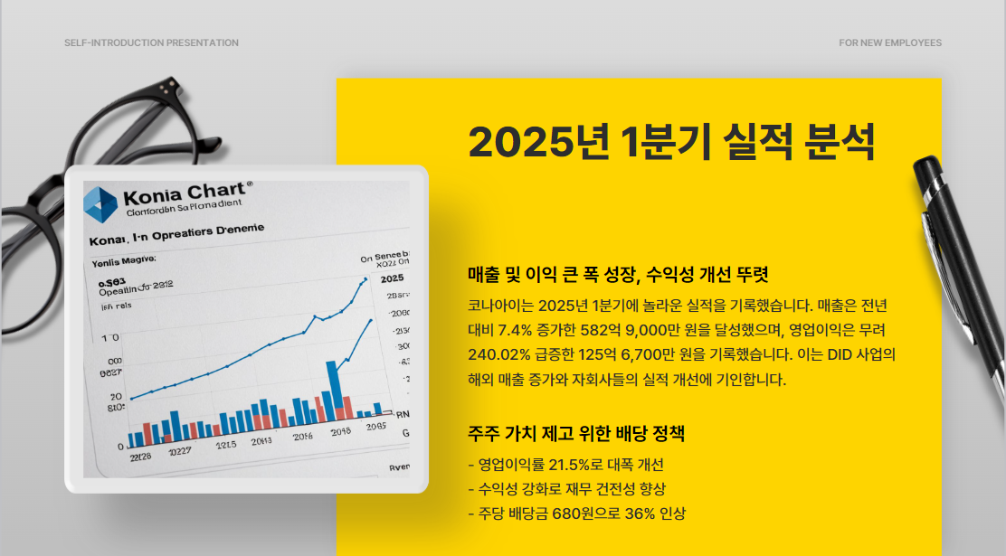 2025년 1분기 코나아이는 연결 기준 매출 582억 9,000만 원(전년 대비 +7.4%), 영업이익 125억 6,700만 원(전년 대비 +240.02%)을 기록하며 깜짝 실적을 발표했습니다. 이는 DID 사업 해외 매출과 자회사 실적 개선이 주효한 결과이며, 영업이익률 또한 21.5%로 수익성이 크게 강화됐습니다. 주당 배당금도 680원으로 36% 인상해 주주가치 환원에도 힘을 싣고 있습니다.