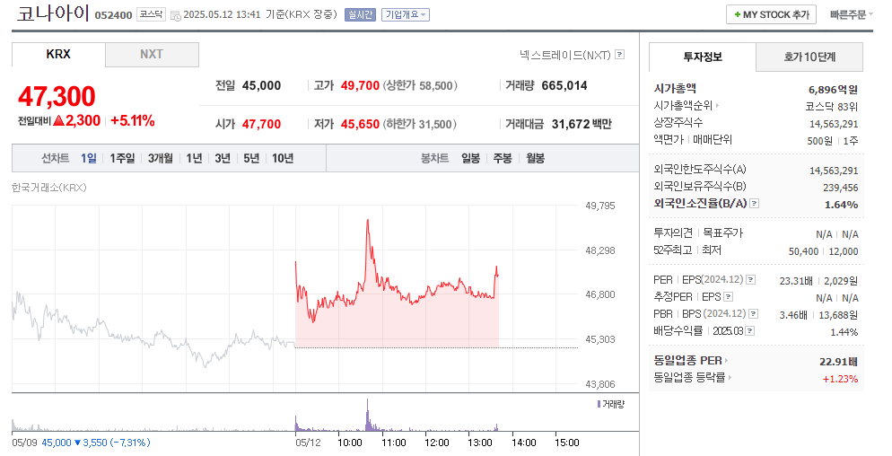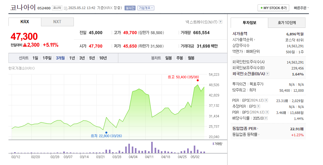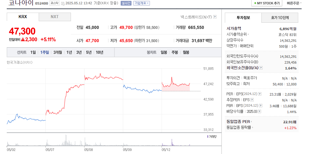 2025년 5월 초, 코나아이는 47000원을 기록하며 단기 고점을 찍은 뒤 조정 후 반등세에 진입했습니다. SKT 유심교체 수요 이슈, 정책 기대감, 실적 발표 등 연이은 재료가 겹치면서 주가는 단기하락해서 35,000원대로 내려갔지만 . 외국인 수급은 최근 순매수 흐름을 보이며 중기적 상승 기대감을 높이고 있습니다.