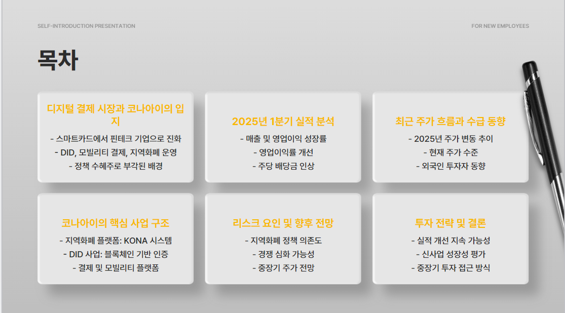 2025년 1분기 실적을 통해 코나아이는 ‘내실 있는 성장’을 입증했습니다. 결제 플랫폼의 안정성과 신사업 성장성, 주주 친화적 정책 강화까지, 코나아이는 지금이 아닌 ‘앞으로’에 더 주목해야 할 종목입니다. 단기 등락에 휘둘리기보다는, 12개월 이상 보유 전략으로 접근하는 것이 보다 합리적일 수 있습니다.