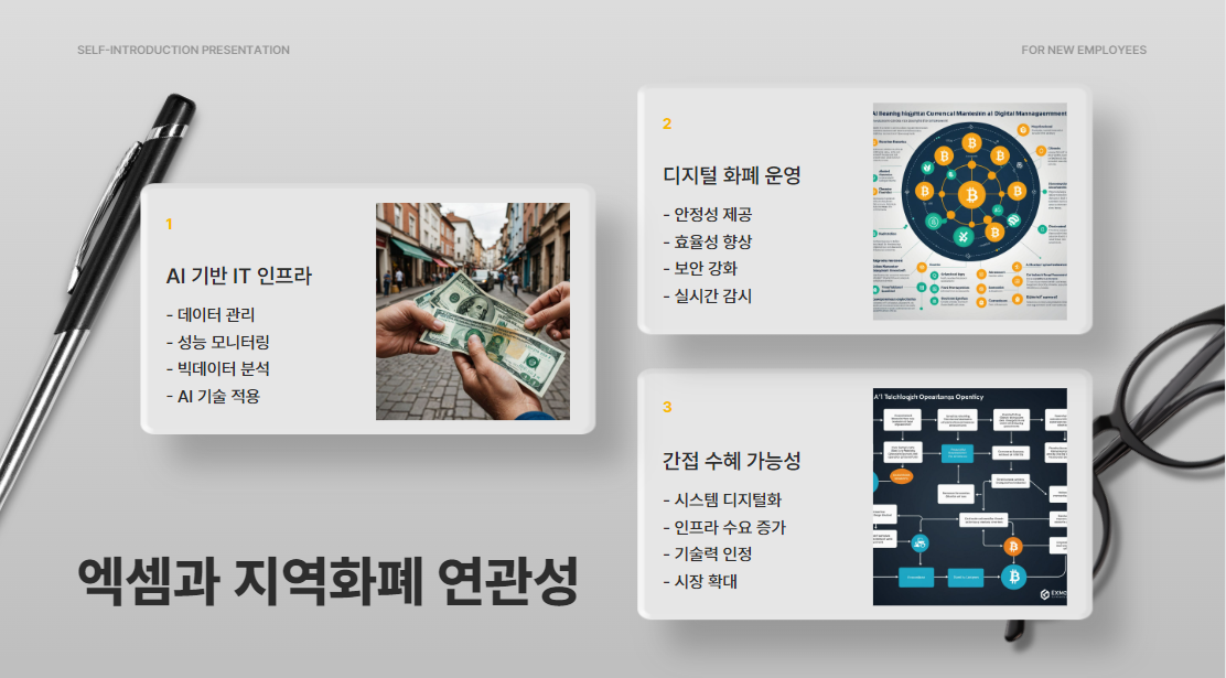 엑셈은 직접적으로 지역화폐 사업을 영위하진 않지만, AI 기반 IT 인프라 기술을 통해 디지털 화폐 운영의 안정성과 효율성을 제공할 수 있어요.