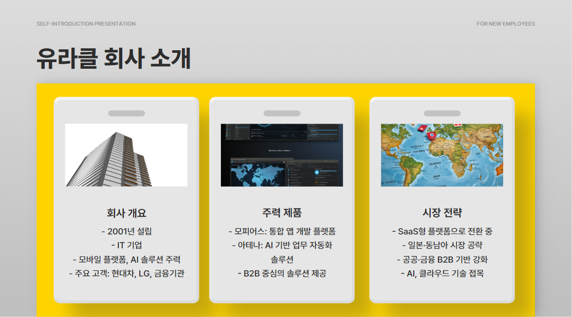2001년 설립된 유라클은 모바일 플랫폼과 AI 솔루션을 주력으로 하는 IT 기업입니다.