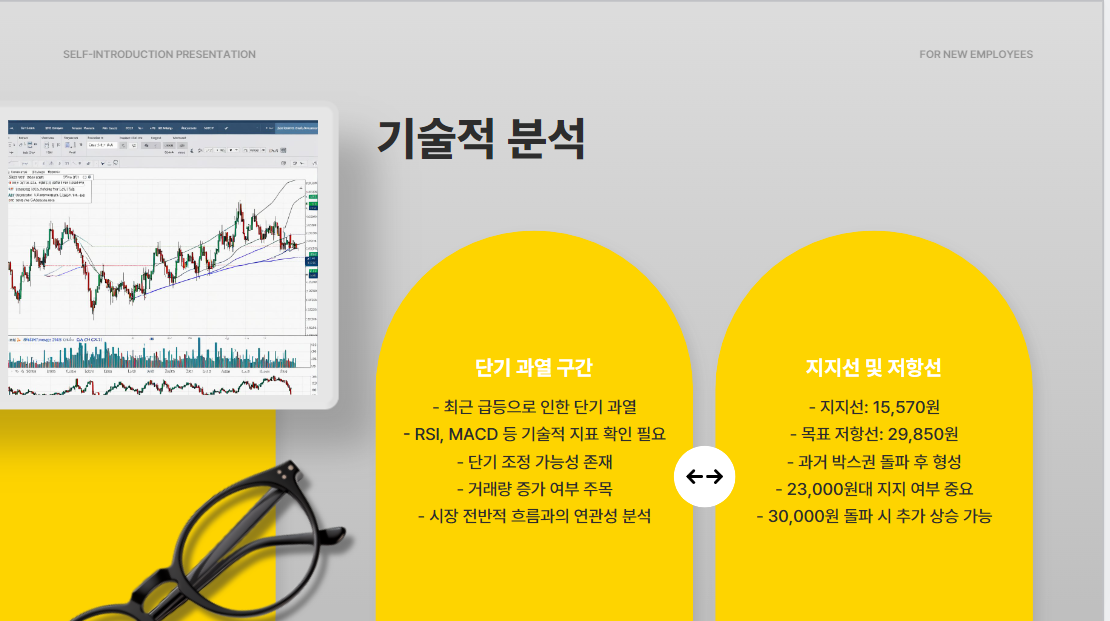 현재 주가는 단기 과열 구간이나, 과거 박스권 돌파 후 지지선은 15,570원, 목표 저항선은 29,850원으로 예상됩니다.