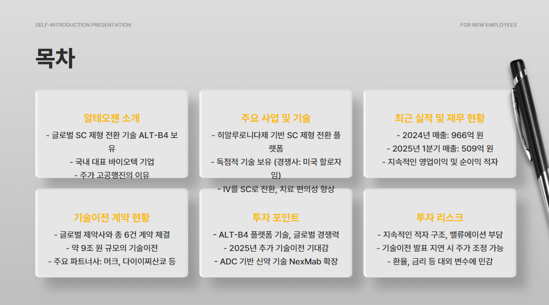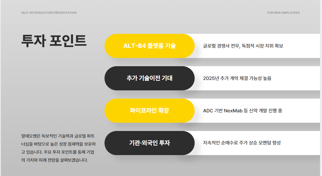 알테오젠은 2025년에도 ALT-B4 기반의 글로벌 기술이전과 플랫폼 수익화 기대감으로 높은 관심을 받고 있는 기업입니다. 아직 실적은 적자지만 기술과 계약 실현 가능성이 주가를 지지하고 있으며, 투자자라면 뉴스에 대한 민감도와 분할매수 전략이 필요합니다.